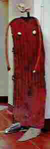 in blue and red. A curtain of painted metal plates of old oil cans hangs
